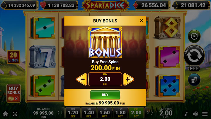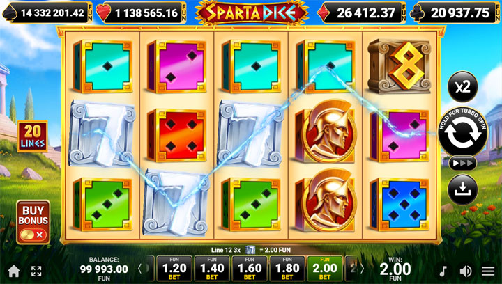 สล็อต Sparta Dice มีโครงสร้างมาตรฐานแต่ทรงพลัง ด้วย 5 รีล 3 แถว และ 20 เพย์ไลน์คงที่ ผู้เล่นไม่สามารถปรับจำนวนไลน์ได้ แต่สามารถเลือกเดิมพันต่อไลน์ได้ตั้งแต่ 0.01 ไปจนถึงระดับสูงสุด ทำให้เหมาะกับงบประมาณทุกขนาด ไม่ว่าจะเป็นผู้เล่นมือใหม่ที่เดิมพันต่ำหรือ high roller ที่ชอบเสี่ยงใหญ่